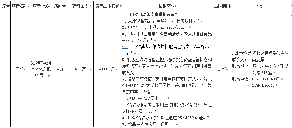 出租场地概况:由于出租场地为学生学习和生活的公共场所,所以场地的一切情况均以实地现状为准,且对外租赁的场地为东北大学所属公用房产,如遇政府行为改造和迁移以及东北大学规划的扩建及征用等相关事项,承租人应无条件予以配合迁移或撤出。请参加公开招租的单位务必于报名前看清和了解所招租场地之现状及瑕疵。参加公开招租者一旦报名,即表明已了解并认可所招租场地的品质、瑕疵等一切情况,我方不保证所招租场地品质及缺失,也不承担瑕疵担保责任,请在签订场地出租合同前谨慎考虑。
