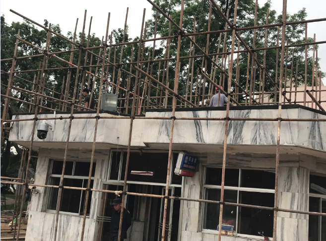 对于上述隐患,检查组当场研究制定了整改措施。要求施工人员立即戴上安全帽并在今后施工中严格按照安全要求施工;着手更换七舍门斗钢化玻璃;在主楼西阶一和东阶一外侧地面安装挡水隔板。