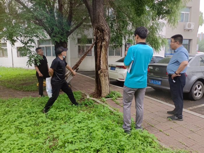 检查组发现,主楼门前一棵倾斜生长的松树支撑脱落,有倾倒风险;办公楼西侧一棵柳树树干腐烂严重,有被风刮倒的危险。检查组要求,主楼门前松树要抓紧时间重新安装加固支柱,办公楼西侧柳树要联系绿化部门抓紧时间处理掉。