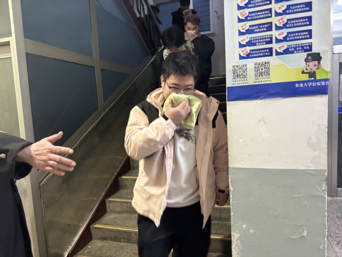 17点50分,宿舍消防逃生演练在学生六舍正式开始。首先由公安处副处长王克新讲话,王克新介绍了近期安全形势,本次演练的重要意义,并提醒学生在演练过程中注重安全。沈河校区管委会综合办公室主任曹华龙详细讲解了本次演练的具体步骤和注意事项。为了保证演练的效果,本次演练设置了警报装置。宿舍两处逃生出口分别由保安引导。